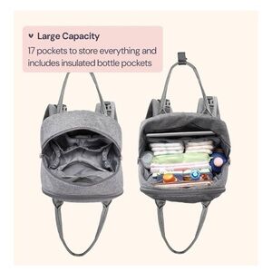 Elevate your style with this sleek gray baby backpack. New ready to hold your baby gear.