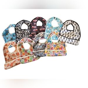 Brighten up mealtime with this colorful set of kids' bibs. Featuring fun patterns in blue, black, and orange, these bibs are perfect for keeping your little one clean and stylish.