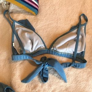 Top has ruffles along the seam of the breaths cup and bottom has ruffles on the side seam