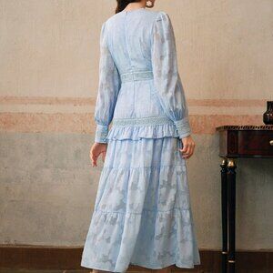 Baby Blue Elegant Women's French Style Ruched V-Neck Puff Sleeve Maxi Dress
