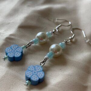 These matching dangle earrings have a white pearl with a baby blue flower attached to them. Simple and Sweet for any outfit to give it that classic Cottage Core or coquette look with the pearls. Perfect to wear to picnics, birthdays, or even going to the store!