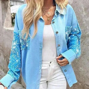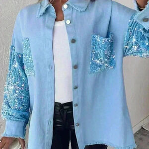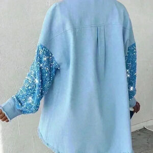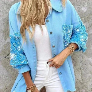 Baby Blue Party Women's Turn-Down Collar Sequin Raw Hem Shacket