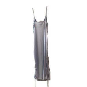 Unbranded, baby blue, 95% polyester, 5% spandex, sleeveless, pullover, slip dress in a women's size extra large. Adjustable spaghetti straps. The sides have ties which can be pulled to ruche them as much or as little as your want. The front neckline drapes like a cowl. The back is smooth. the fabric has a satin sheen to it. Machine washable. Approximate measurements shown in photos. In good pre-owned condition.
