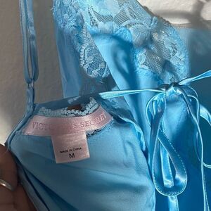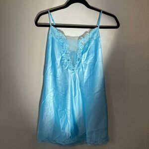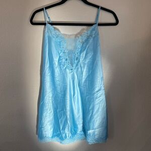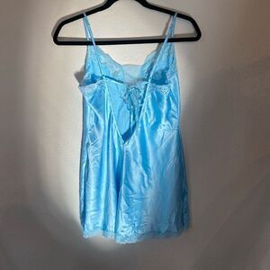 Deep V intricate floral lace trim neckline with mesh panelling in front, matching lace skirting the bottom hem. Adjustable spaghetti straps, chemise is very short and cheeky, almost baby doll style. Back has a low cut with a tie for adjustable fit. Leg slit on both sides.