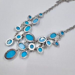 Baby Blue Shiny Silver Tone Small Bib Statement 14” Choker Necklace. Center of bib is 2.25” long and the extender chain is 3” long. Necklace is previously loved and is in excellent condition.