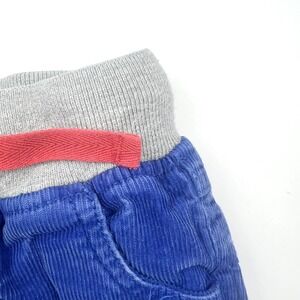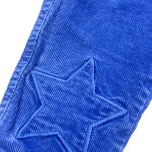 Stylish blue corduroy pants. Features gray waistband with red drawstring. Star patch details on knees. Excellent condition.