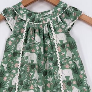 Sweet and playful Baby Boden dress featuring an allover jungle animal print. Elephants, monkeys, cheetahs, and birds make this piece perfect for your little explorer. Color: Green base with white/pink jungle animal print. Sleeveless flutter dress with ric rac trim and button back closure. Gently worn with no flaws.