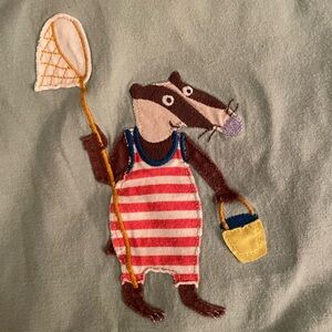 Charming t-shirt with a cute badger graphic. Ideal for playful days. Features Appliqué in striped bathing suit carrying bucket and net, ready for adventure or the beach. Unisex, cute for boys and girls!