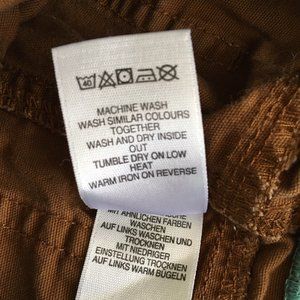 Beige pants with a teal and beige striped elastic waistband, by Baby Boden. These pants can be rolled or folded up to wear as shorts, using the hidden tabs and side buttons.