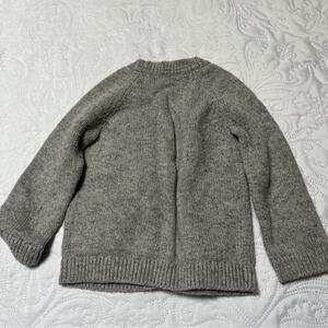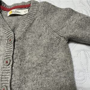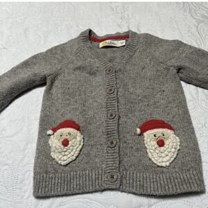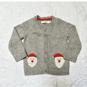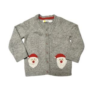 Baby Boden long sleeve knit cardigan sweater. Gray with holiday Christmas Santa Claus appliqué design. Good condition, minor wear / pilling. Size 12-18 months.