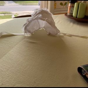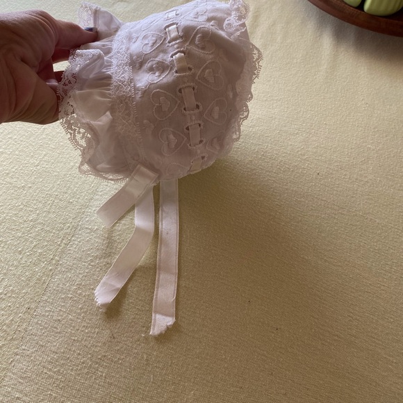 Old fashioned baby bonnet! A beautiful touch on an already beautiful baby girl! Size 0-3 months.