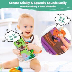 Baby's First Library: Baby boys or girls love these early learning toys. The bright colors will catch baby's attention, the crinkle feature on both cover pages and squeaker sound improve baby's audio recognition and motor skills, textured animal tails provide sensory interaction. These interactive cloth books help babies engaged for endless hours of fun!