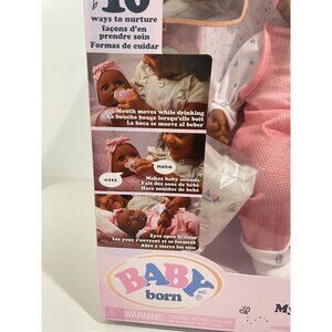 This interactive doll features lifelike abilities such as eyes that open and close, drinking, and sound effects. Includes clothing, diaper, and pacifier accessories.