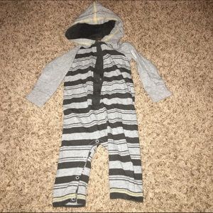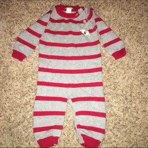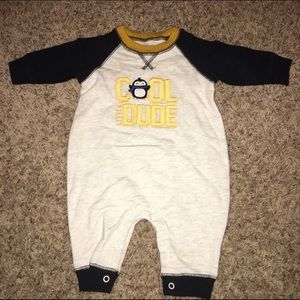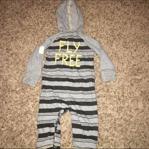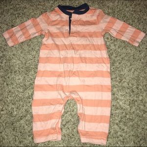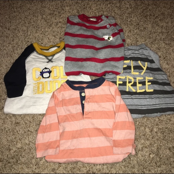 All long sleeved onesies. Cool dude sweatshirt onesie: Carters size 3 Month. Salmon cotton onesie: 3-6 month Baby Gap. Fly Free onesie: 3-6 Month Burt's Bees organic cotton onesie. Red and gray striped onesie: 6 month Cherokee.