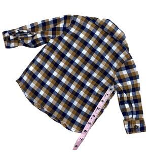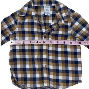 - A cozy tan, navy blue, and white flannel long sleeve shirt in size 6 months. (Carter's) 100% Cotton