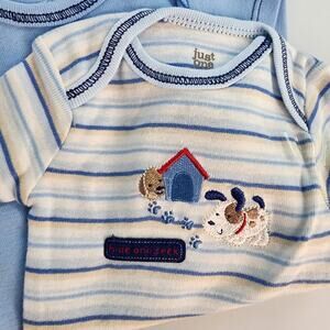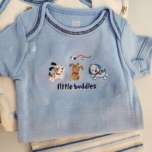 Baby boy one piece snap suits and a brown bear lovie blankie. All are new, they were baby gifts I never used. The outfits are 100% cotton. The bear has satin lining. there are a couple snags on the satin from storage as shown in the photos