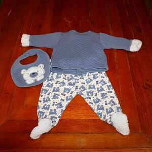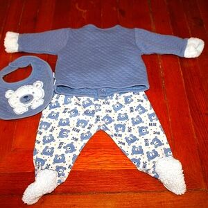 1 Bear-themed outfit with long sleeve top, footed pants, and matching bib (blue/white)