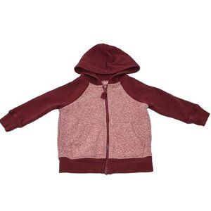 The Burgundy and Mauve Sweatshirt has a hood and has a zipper closure and a zipper pull. It is 60% cotton and 40% polyester.