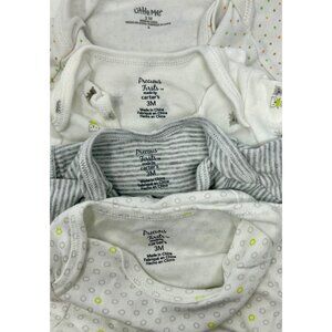 A charming set of baby boy's body suits from renowned brands Carter's, Precious Firsts, and Little Me. Comes in white with multicolor dots, white with teddy bears, white with green and grey circles, and grey and white stripe design. These body suits are size 3 month and made with comfortable cotton.