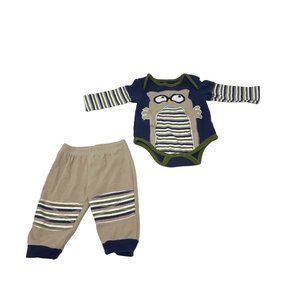 • Navy Blue Long Sleeve Body Suit with an Owl in Tan with Navy, Tan, Olive Green, & White Striped Tummy, Trimmed in Olive Green with Navy & Striped Sleeves