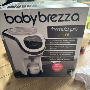 Baby Brezza Formula Pro Mini in black and white. Automatically makes warm formula bottles. Perfectly mixes and dispenses formula. Comes with the base riser for taller bottles. All new in box. Never used.