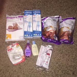 Brand new never used bundle of baby stuff includes a small sample pack of size 1 diapers with 2 in the pack 2 Dr. Brown natural flow 4 oz baby bottles 2 Phillips Avent natural bottles a nuk orthodontic pacifier 1 mini Johnson bedtime bath body wash 1 mini aveeno baby lotion and a sample of eucerin baby eczema relief lotion