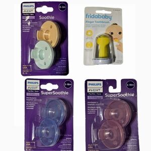 This is a bundle of 6 pacifiers {4 are 3-18 months (Super Soothie)/2 are 0-3 months (Soothie) and a Fridababy Finger toothbrush. All items brand new and sealed in package.