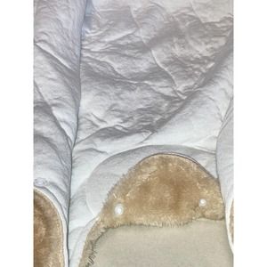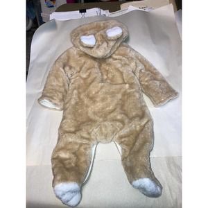 Adorable and so so soft light tan winter jumpsuit that has an adorable bear ears hood. Snaps closure all the way down to feet for easy on and off and diaper change. 100% polyester. Hand wash.