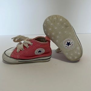 Super cute chuck Taylor converse all star baby shoes size one. These are in good condition, only flaws to note would be stain/discolouration on the shoelaces and discoloured on the sole of the shoe due to use.