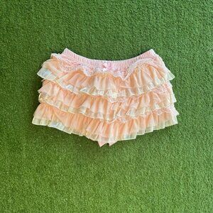 These delicate shorts are the perfect piece for a soft and feminine look. The tiered ruffles and lace trim give them a charming coquette aesthetic. They can be worn as a statement piece with a simple tank top or layered under a mini dress for a romantic, playful vibe.