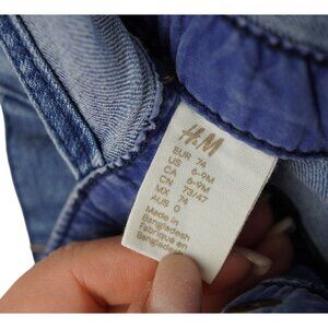 Stylish and durable H&M denim overalls designed for toddlers aged 6-9M months. Features adjustable straps and a front pocket, suitable for both boys and girls. Snaps down the legs for easy changing.