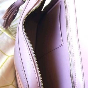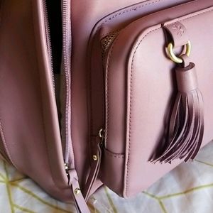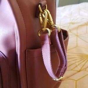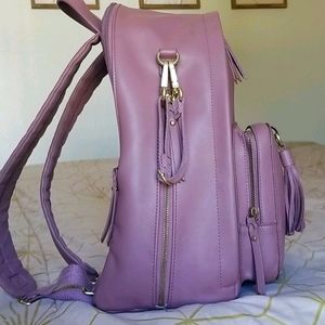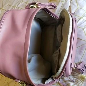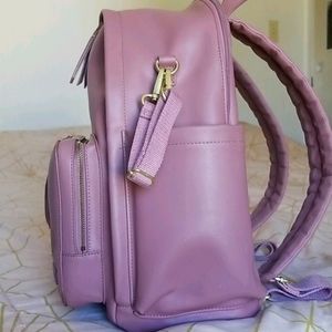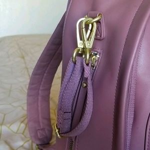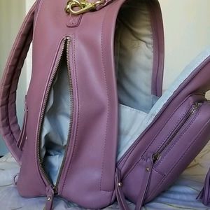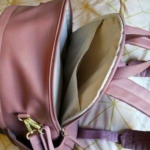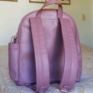 Mauve Diaper backpack. Very functional and large to fit everything for baby. Large main compartment with two extra pockets inside. Flat compartment in back of back with extra pocket. Sides of bag has bottle holder on one side and other has compartment for easy access to baby wipes. Front pocket functional for keys wallet or baby's toys. Side straps on each side to clip bag to stroller when you need a break. Functional zippers on each pocket. Small amount of pen on front pocket. See picture.