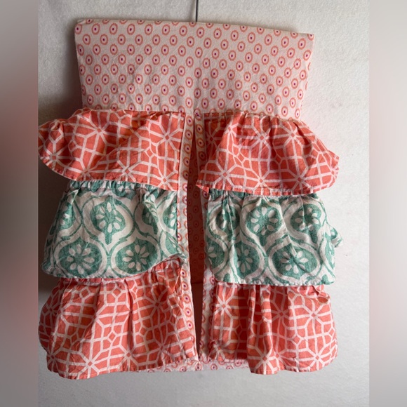 Vibrant top with ruffled layers. Features a geometric and floral pattern in coral and teal.