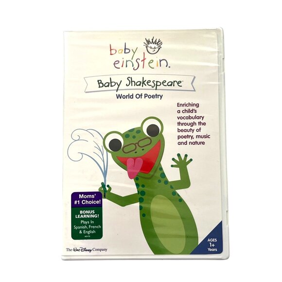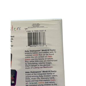 Baby Einstein Baby Shakespeare World Of Poetry 2003 DVD New Sealed provides enriching content for children aged 1+, introducing 12 common words through the beauty of poetry, music, and imagery. Includes interactive features such as puppet shows, repeat play, and language tracks in Spanish, French, and English, all set to Beethoven's music.