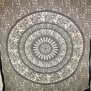 The center mandala explodes in a celebration of chakra designs followed by festival elephant mandalas. The background also has elephant prints all over this beautiful tapestry.