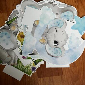 Die-cut cardboard elephant centerpieces (2 different designs: winking elephant on cloud, sitting elephant with flowers)