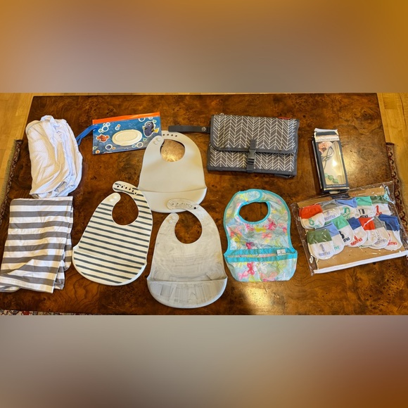 Includes bibs, changing mat, and baby monthly photo socks. Car seat cover, sleep sack
