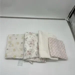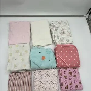 7 Burp Cloths & 2 Towels – Gently Used, Soft & Clean in various colors and patterns. Includes pink, white, blue, and floral designs