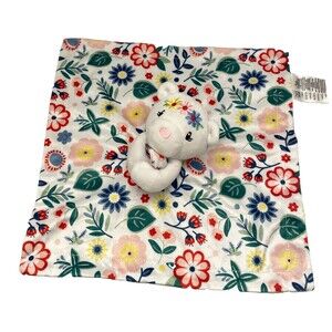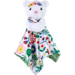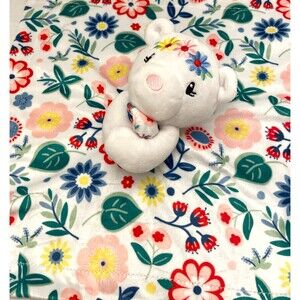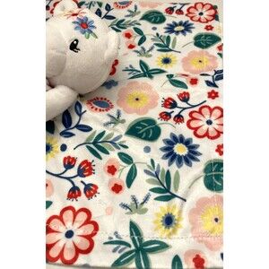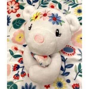 Beautiful Baby Essentials floral print lovey featuring a white plush bear with flowers around her head. This security blanket measures approximately 13" x 13" and is super soft. It is in excellent condition.