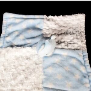 The blankie is a super soft fleece with textured surfaces. Two squares are white and two are blue with white stars. Soft, soft, soft, cute, cute, cute!! Did I mention how soft and cute this lovey is???