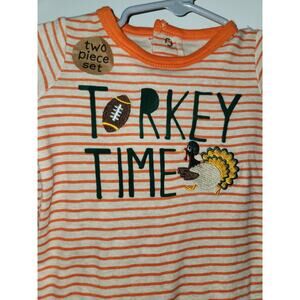 Adorable two-piece set featuring a striped footed romper and matching hat, perfect for Thanksgiving festivities. The romper showcases a playful "Turkey Time" design with an embroidered turkey and football detail, adding a touch of whimsy to the outfit. Soft and comfortable, this set ensures your little one stays cozy. Ideal for Thanksgiving dinner, family photos, or autumn-themed gatherings, this set combines festive charm with practicality.