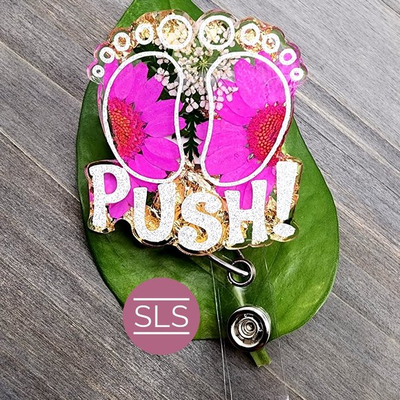 Baby Feet Floral Badge Reel With Push-OBGYN Badge Reel-NICU Nurse-OB Nurse Badge