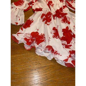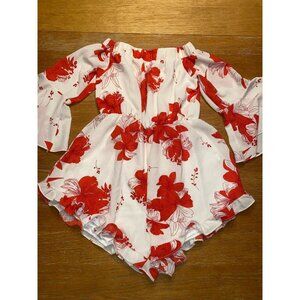 This charming baby romper features a vibrant floral design in striking red hues on a soft white background. The off-shoulder style, accentuated by gracefully fluttering bell sleeves, creates a whimsical and delightful appearance. It is thoughtfully designed for the adventurous spirit of little girls who adore playful elegance while enjoying absolute comfort.