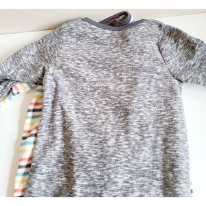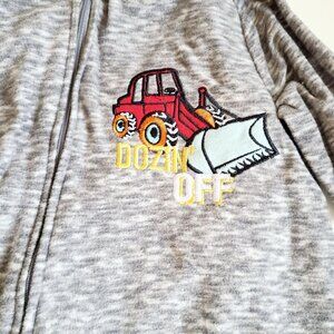 These cozy baby pajamas come in a set of three, featuring playful vehicle and stripe patterns. Each pajama has a secure zip closure and soft fleece material, designed to keep your little one warm and comfortable during sleep. Two are 2T, and the stripped one is a 4T. Never worn, removed tags and washed, minor spot on the foot area of one pajama.