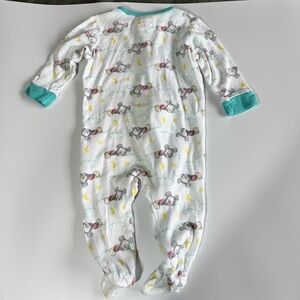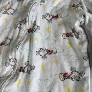 #1 White Disney pajamas, size 6-9 months. Footie pajamas feature Mickey Mouse, teal trim, a zipper up the front, and a snap closure.