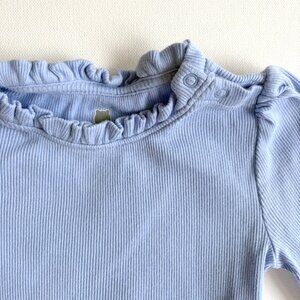 Baby GAP long sleeve periwinkle blue onesie with ruffled wrists and collar, snap closure at crotch and shoulder.
