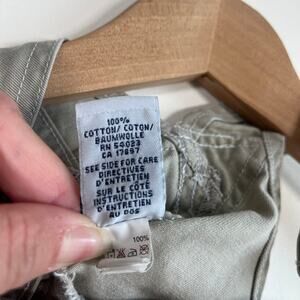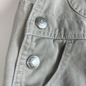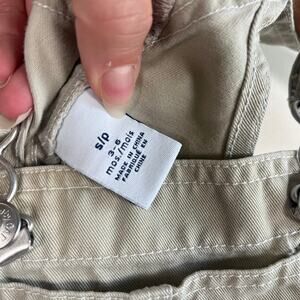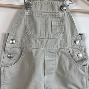 Adorable Baby Gap Classic overalls in a versatile khaki beige color. Made from 100% cotton for comfort and breathability, perfect for everyday wear. Features adjustable straps, multiple pockets, side button closures, and snap buttons along the legs for easy diaper changes.