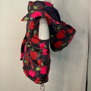 Vibrant puffer vest with apple print. Features shades of red, pink, and green on a black background. Perfect for adding a pop of color.