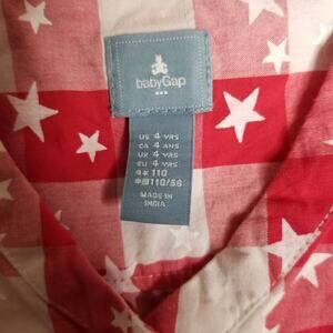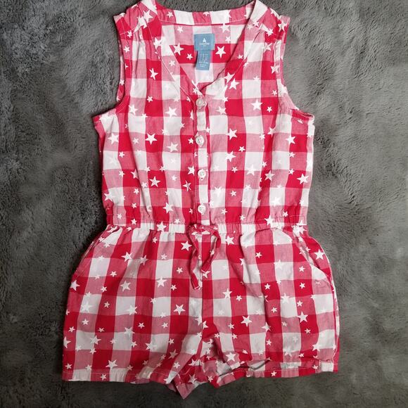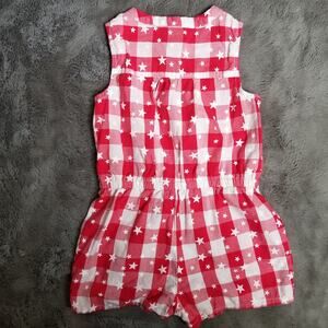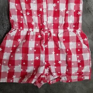 Excellent used condition. Baby Gap factory, red and white picnic plaid gingham print romper. White star pattern, tie waist, sleeveless, button up front from waist up.