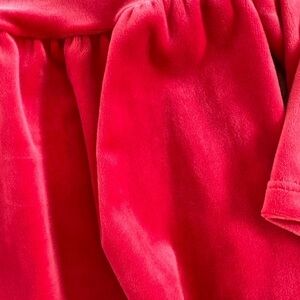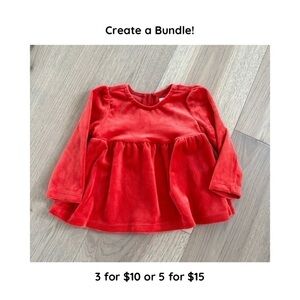 This top is in excellent condition! There are no rips, tears, pulls, or stains. I personally purchased this top for my littlest love but she has since outgrown it and it is time to pass it on to someone new! It is a super soft red velour-type fabric. It is thick and sturdy and has a button on the back to allow for each on and off. The peplum allows for a comfortable loose fit. This top is a great choice from fall to the winter holidays to Valentine's Day!